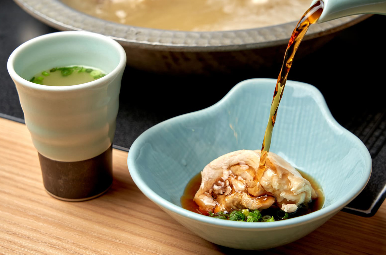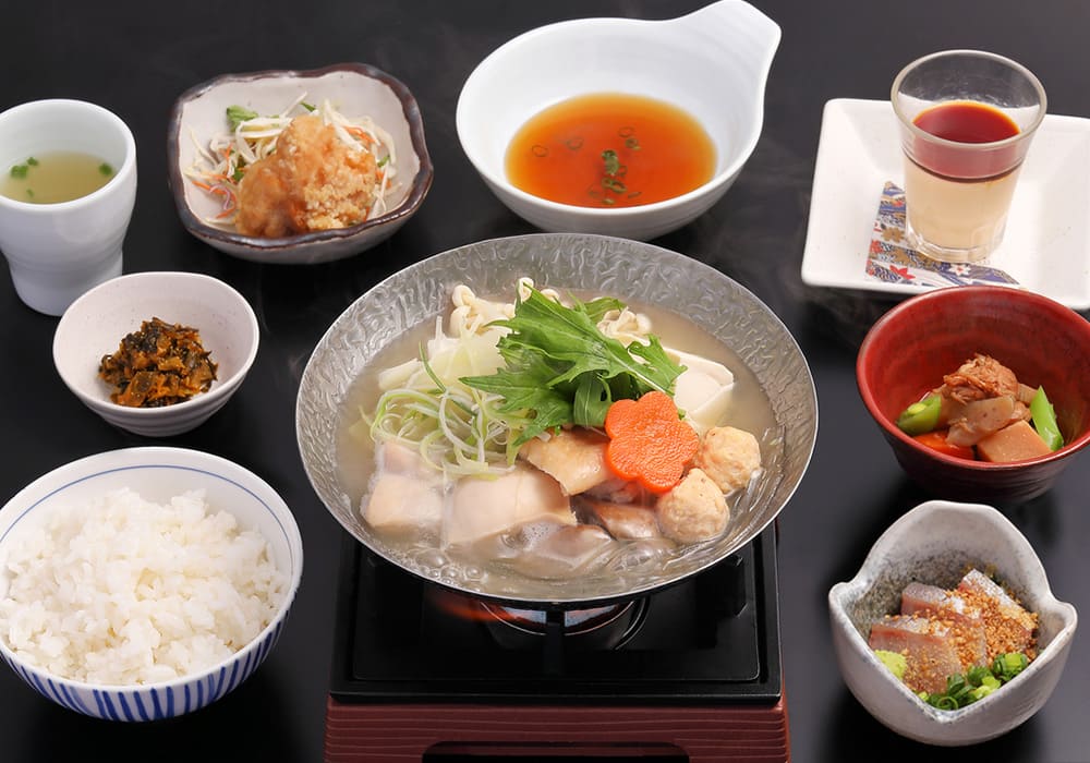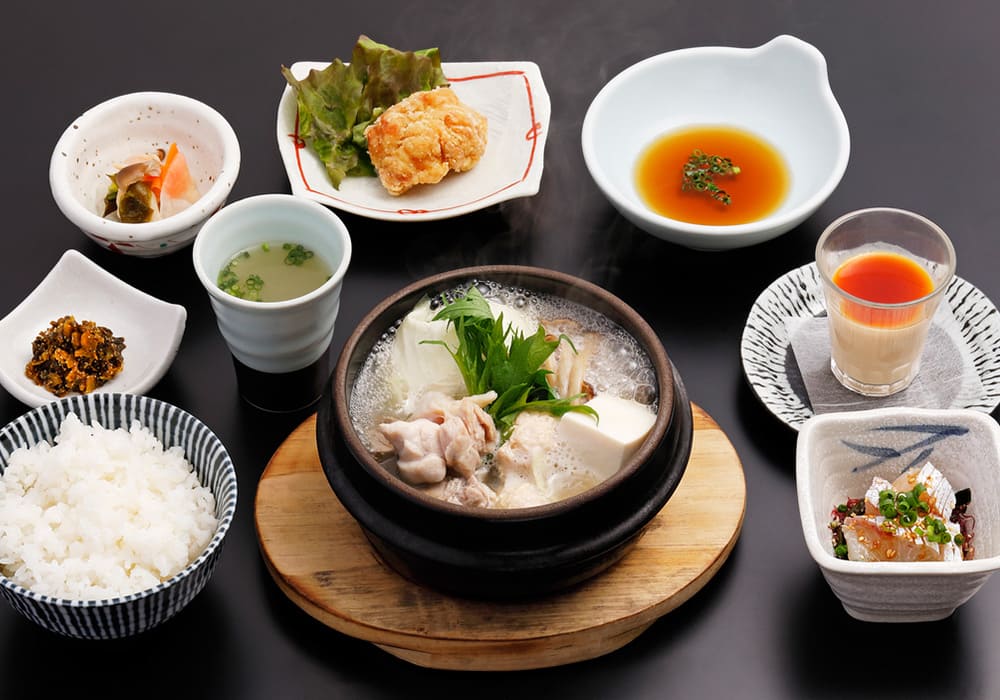 水たき小鍋/ごまカンパチ/唐揚げ/小鉢/白飯/スープ/香物/甘味