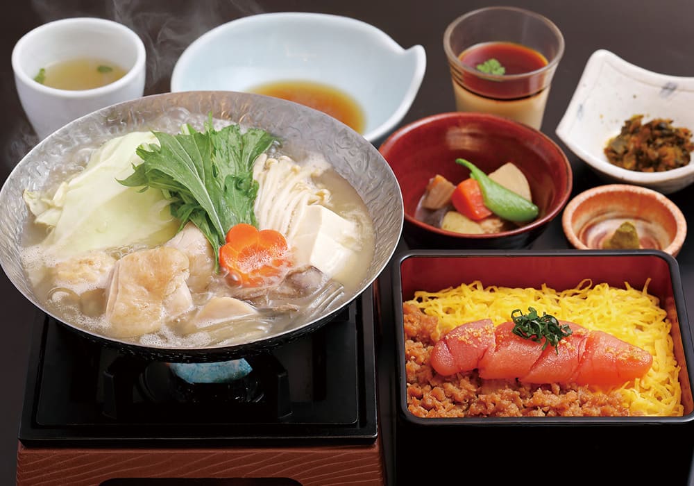 ミニ明太鶏そぼろ重/水たき小鍋/小鉢/スープ/香物/甘味