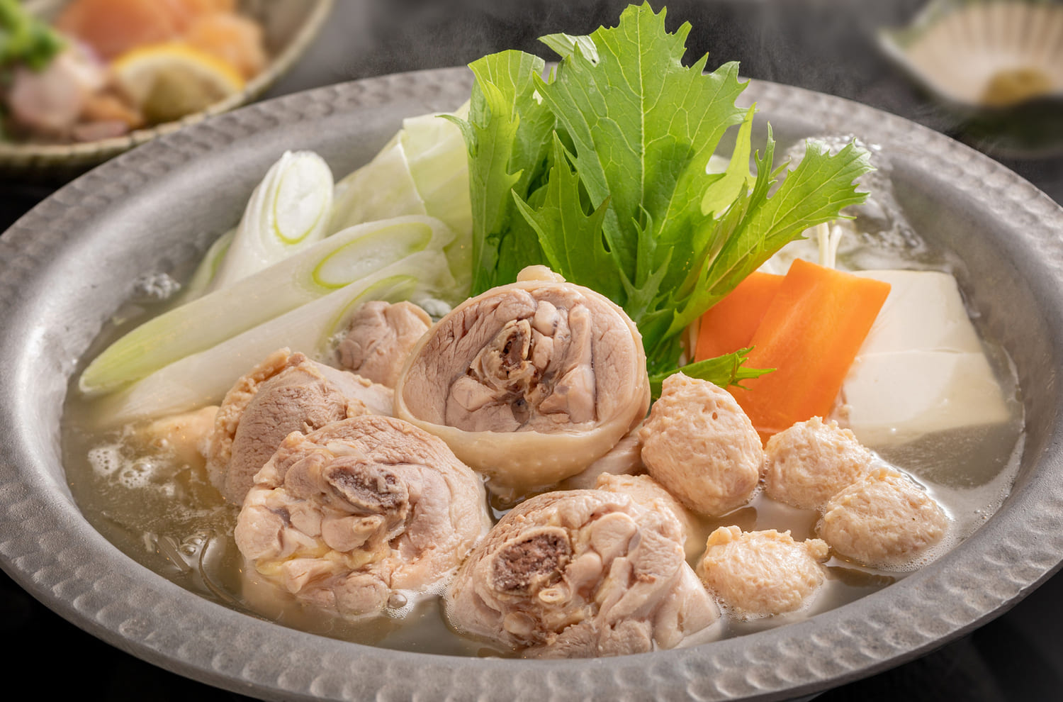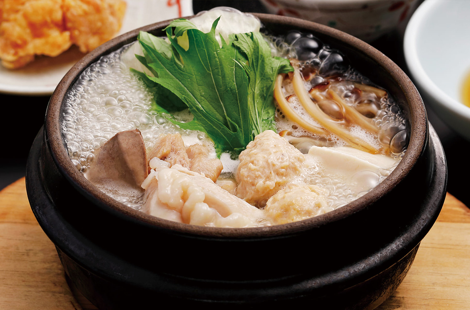 小鉢/前菜三種/華味鳥生ハムと親鳥炭火焼き/替鉢/華味鳥水たき (ぶつ切り・ミンチ・切身・肝・野菜盛・雑炊または麺) /めんたい高菜/甘味