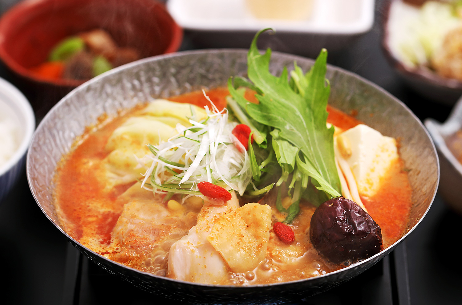 小鉢/ごまかんぱち/唐揚げ1個/薬膳小鍋/白飯/スープ/香物/甘味
