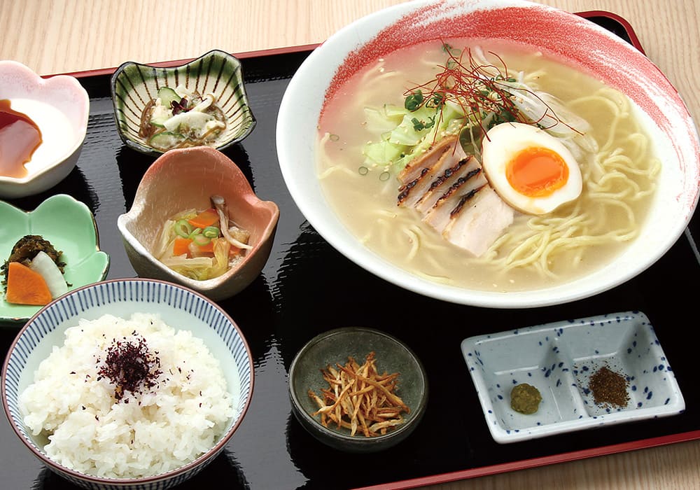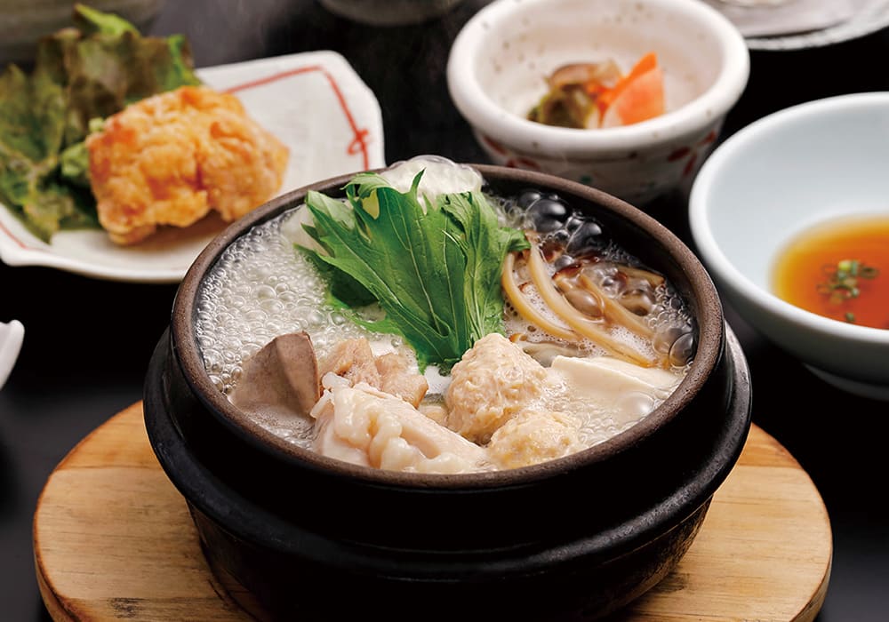 水炊き小鍋/唐揚げ/水炊きスープ/ご飯/小鉢/自家製明太子