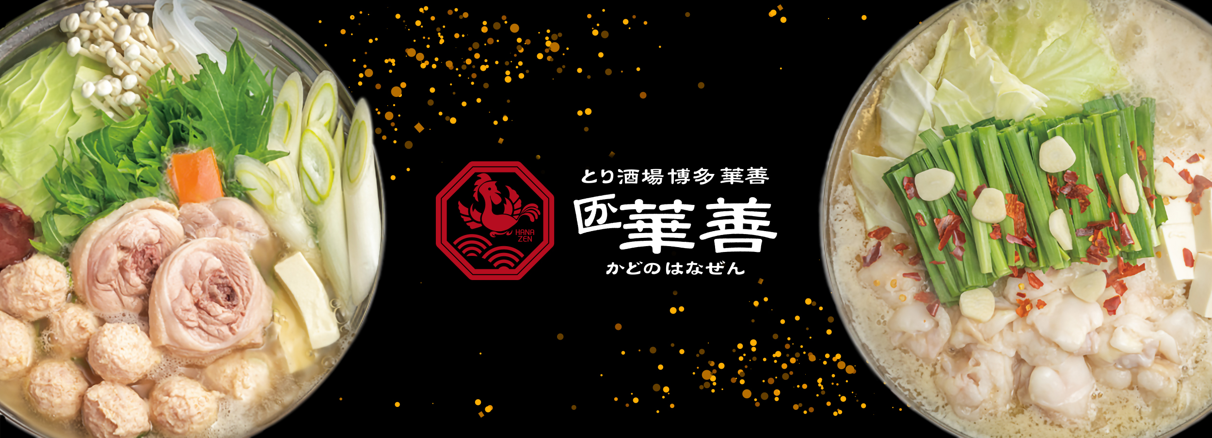 小鉢/華善サラダ/出汁巻き玉子/ごまカンパチ/親鳥もも炙り焼き/博多とり皮巻き巻き串/もつ鍋(※水炊きの場合は+500円(税込))/〆のちゃんぽん